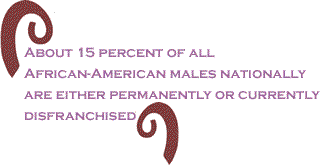 Mass incarceration, of course, breeds mass political disfranchisement. Nearly six million Americans today cannot vote. In seven states, former prisoners convicted of a felony lose their voting rights for life. In the majority of states, individuals on parole and probation cannot vote. About 15 percent of all African-American males nationally are either permanently or currently disfranchised. In Mississippi, one-third of all black men are unable to vote for the remainder of their lives. In Florida, 818,000 residents cannot vote for life.